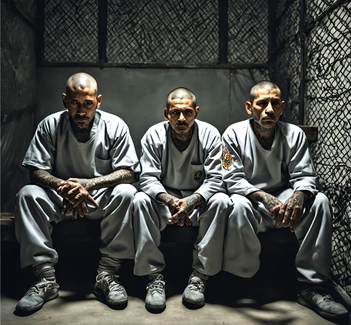 Armed guards with dogs then start to bring in the inmates in groups. Most of the prisoners are there for murder and/or kidnapping. They wear identical gray prison uniforms, their heads are shaved, and many are heavily covered with gang-related tattoos. Depending on the perceived threat posed by the inmates at the moment, they may also be shackled on hands and feet.